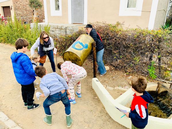 They ticked off each one on the activity sheet as we found it and I wove a story about each. These include a postbox on a house which used to be the post office, a lion on a coat of arms, old motor cars, broekie lace and fretwork and some of Kevin’s wonderful bins. We were fortunate enough to see Kevin at work on the stoep outside his studio.